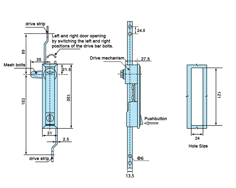 Kunci pintu stainless steel terbuat dari stainless steel dalam warna stainless steel asli untuk daya tahan dan ketahanan korosi. Ukuran pembukaan adalah 24 mm × 121 mm, memastikan kompatibilitas dengan konfigurasi instalasi standar.