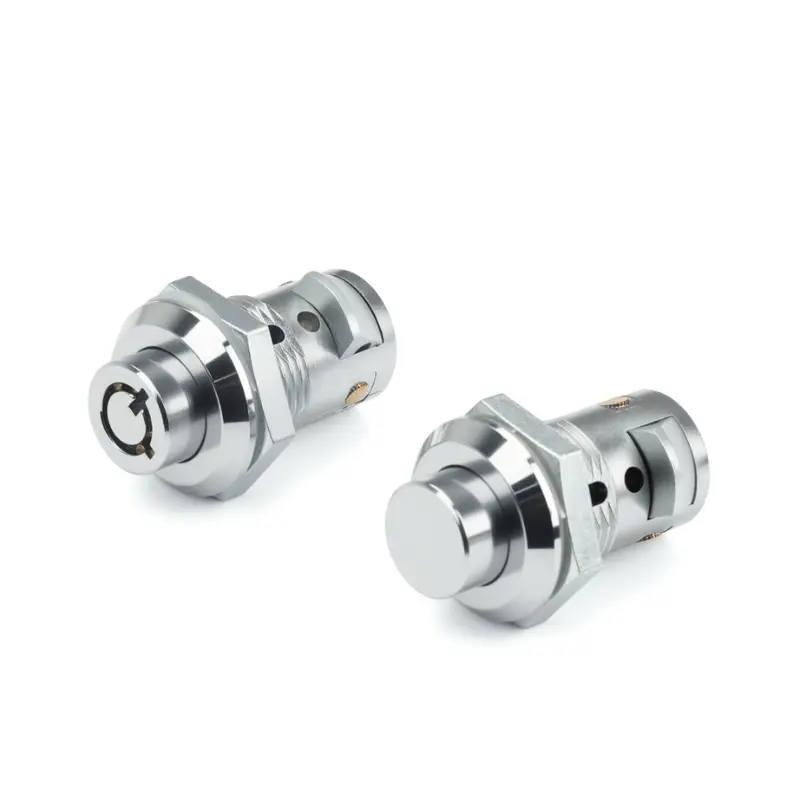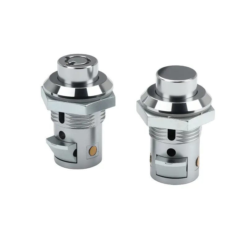 Model tombol tekan terbuka secara otomatis saat tombol ditekan dan terkunci saat pintu tertutup, memberikan perlindungan keamanan dasar. Model kunci pin tumbler menggunakan mekanisme pin yang hanya memungkinkan rotasi dengan kunci yang cocok, memberikan fungsionalitas anti maling. Kedua model menggunakan konstruksi paduan seng untuk menawarkan tingkat kekuatan tertentu, dan dilengkapi gasket tahan air tambahan untuk kepraktisan ekstra. Kunci silinder paduan seng mesin penjual otomatis memiliki lapisan krom cerah untuk ketahanan terhadap korosi. Ketebalan maksimum panel pintu yang dipasang adalah 10 mm. (Untuk bahan baja tahan karat, silakan hubungi kami. Saat ini kami sedang memproduksi cetakannya.)